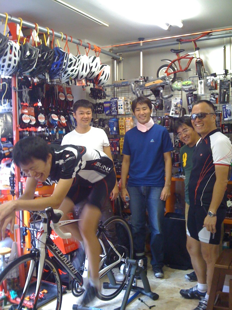 ルールは簡単、3分間でどれだけ走れるか、涼しい店内で人がもがき苦しんでいる姿を眺めているだけなのはなかなか楽しいです(笑。後輪にスピードメーター取り付けて、試乗車をサドルの高さだけ適当に合わせた感じのアバウトさ、初対面の方もいらっしゃいましたがそのアバウトさが逆にお気楽感もあってお互いのコミュニケーションには良かったかなと思います。